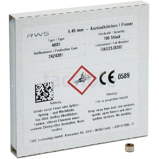 Les amorces RWS Small Rifle 4.45mm garantissent une fiabilité maximale et une combustion régulière dans les cartouches à percussion centrale de petit calibre. Elles sont idéales pour les tireurs sportifs et les rechargeurs exigeants.