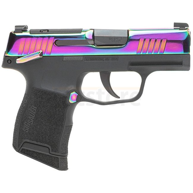 Le SIG Sauer P365-380 Rainbow est un pistolet micro-compact à percuteur lancé, chambré en .380 ACP. Il présente une finition PVD arc-en-ciel brillante sur la glissière, le bouton de chargeur, la sécurité manuelle, le levier de glissière et le levier de démontage, offrant à la fois une esthétique distinctive et des performances fiables.