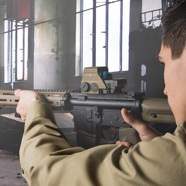 Le viseur réflexe Sightmark Ultra Shot M-Spec LQD en Dark Earth offre un grossissement de 1x avec une taille d'objectif de 33 x 24 mm. Il présente un motif de réticule Reddot-cercle-croix de 65 MOA avec 10 réglages de luminosité, y compris le mode NV. Ave