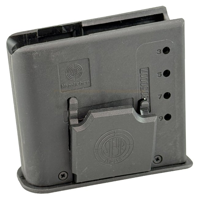 Chargeur Steyr SM12 de 10 coups conçu pour les fusils de calibre .308 Win. Présente une finition noire élégante.