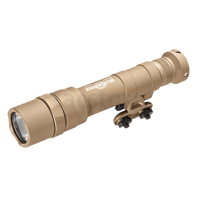 Lampe Scout SureFire M640DF Pro - Tan : Conception résistante au recul. Fixations pour rails MIL-STD-1913 & M-LOK incluses. Comporte un bouton de culot pour les fonctions Momentané et Continu. Émet 1200 lumens avec des piles CR123A et 1500 lumens avec des