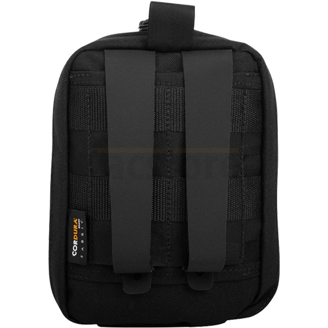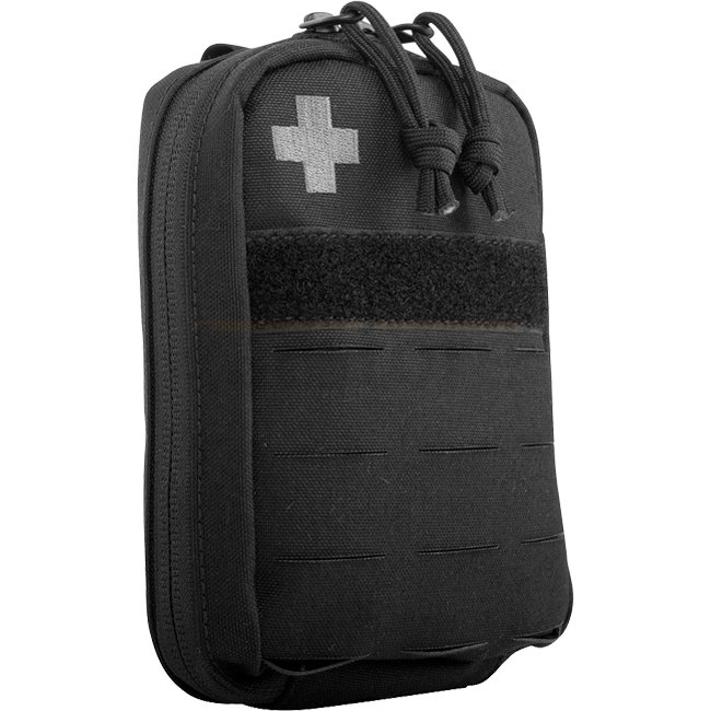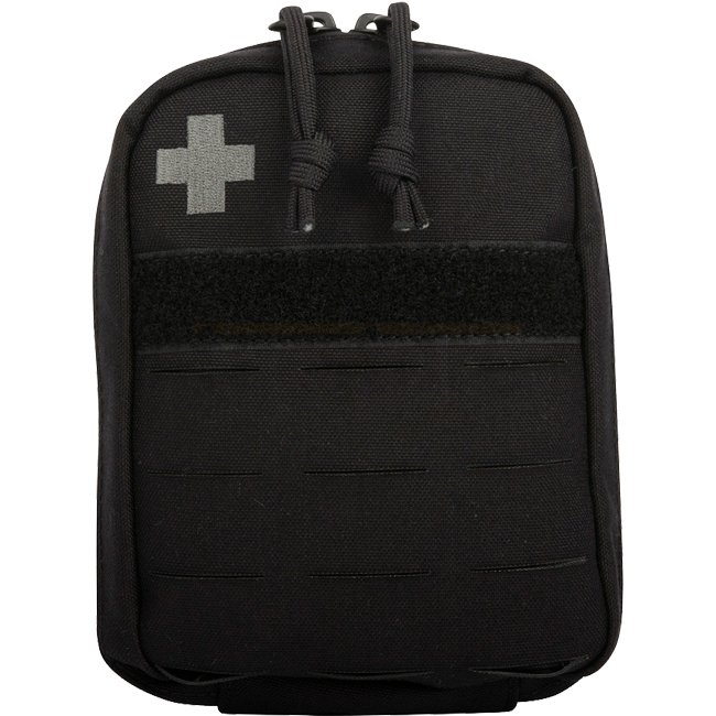 Sac de premiers secours compact avec fermeture éclair nouée pour une prise sûre. Comprend des poches en filet, un patch auto-agrippant, des points de fixation variables et un anneau D interne. Peut être attaché à l'équipement avec une boucle ou porté dire