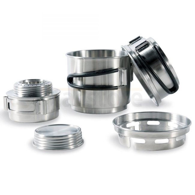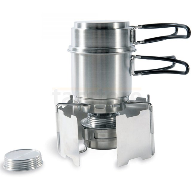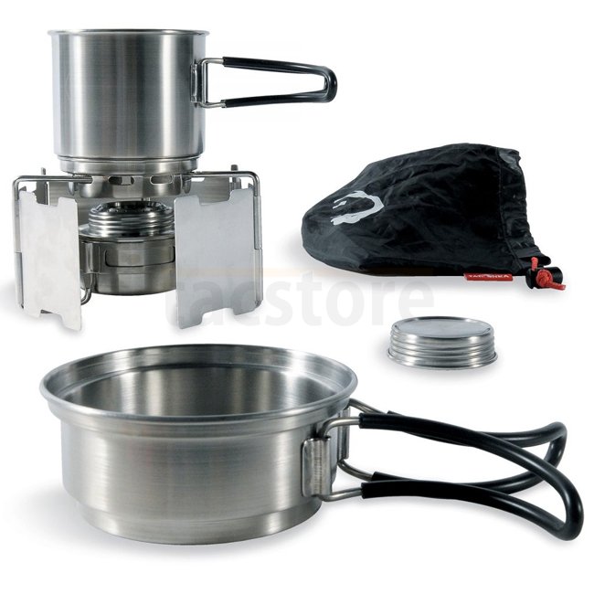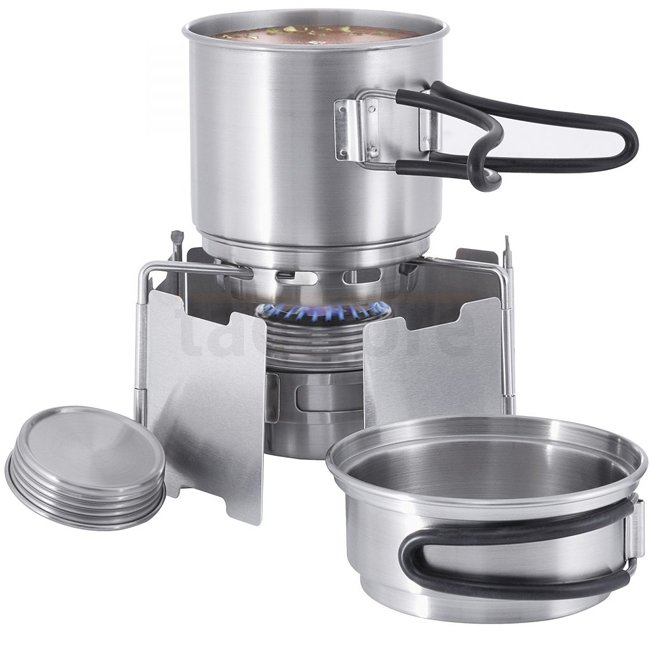 L'ensemble de cuisson se compose d'un brûleur à alcool, d'un pare-brise rabattable (aluminium) et d'une tasse avec couvercle, qui sert également de casserole. Y compris sac à dos pour ranger l'ensemble des ustensiles de camping.
