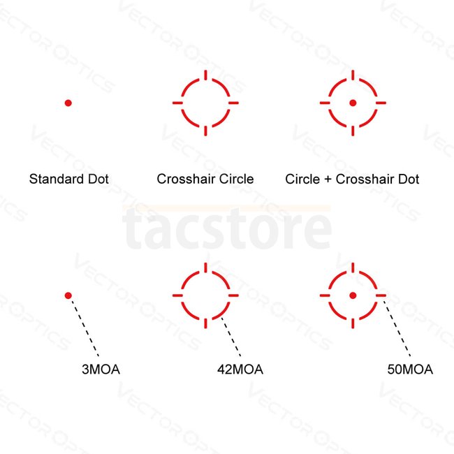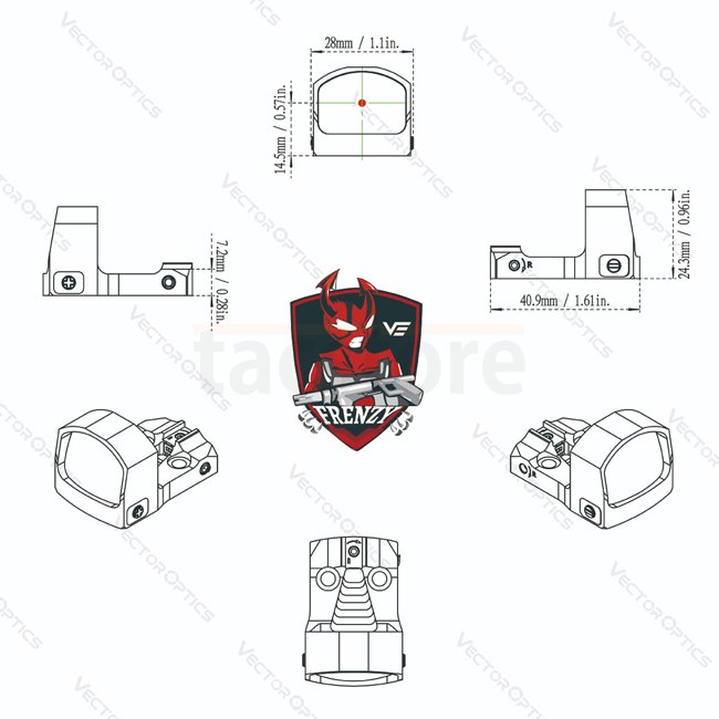 Vector Optics Frenzy-S 1x17x24 MOS Multi Réticule - Noir : grossissement 1x, dégagement oculaire illimité, point de 3 MOA et cercle de 40 MOA, niveaux de luminosité de vision nocturne 8 + 2. Réglage maximal en élévation et en dérive de 45 MOA chacun. Para