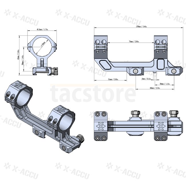 Vector Optics X-Accu monture Picatinny monobloc 30mm en noir avec une inclinaison avant de 20 MOA et un diamètre de tube de 30mm. Fabriqué en alliage d'aluminium 6061-T6. Hauteur de 38mm et poids de 155g. Longueur de 139mm.