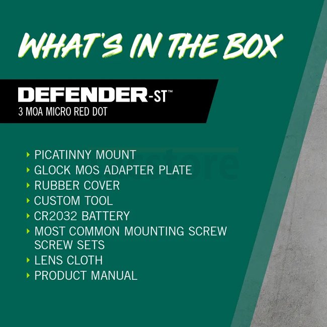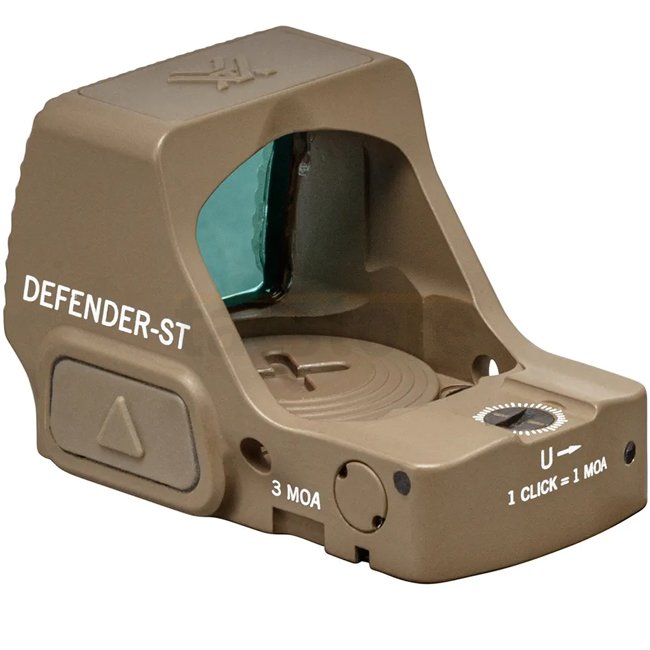 Le viseur Defender-ST Micro Red Dot dispose d’un point rouge 3 MOA avec 10 niveaux de luminosité. Sa lentille asphérique large et durcie assure une image claire, sans distorsion et avec un dégagement oculaire illimité. Son châssis monobloc en aluminium 7075 et l’insertion ShockShield™ offrent une excellente résistance au recul et aux chocs.