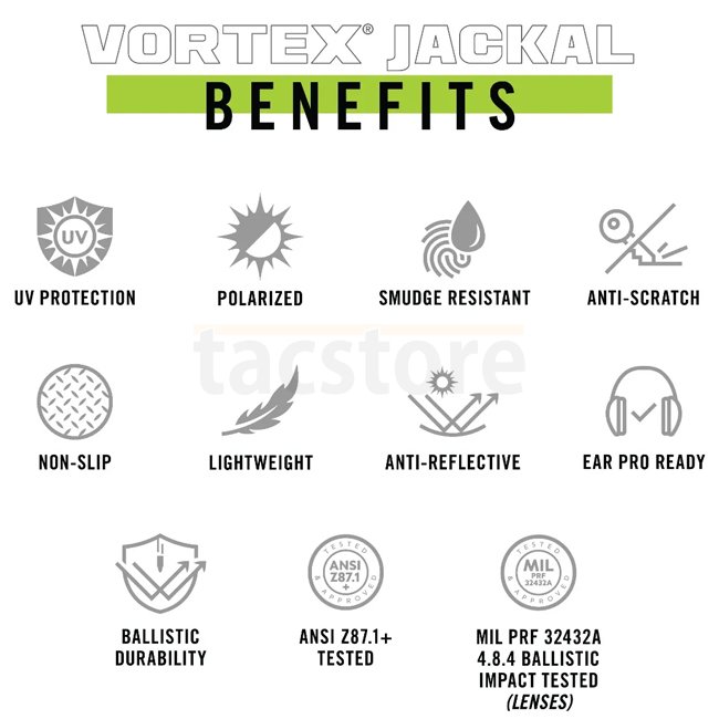 Les Vortex Jackal Performance Sunglasses sont spécialement conçues pour les tireurs exigeants qui ont besoin d'une vision claire et d'une protection supérieure dans toutes les situations. Des premières lueurs au coucher du soleil, ces lunettes de soleil garantissent non seulement la sécurité mais aussi une flexibilité élégante pour chaque aventure. Fabriquées à partir de matériaux légers, flexibles et testés balistiquement, les lunettes de soleil Jackal sont dotées d'un pont et de branches antidérapants pour un ajustement confortable et sécurisé. Différentes couleurs de verres permettent de s'adapter à n'importe quel environnement, de sorte que les cibles restent toujours clairement visibles.