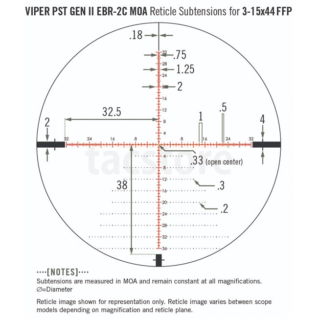 Lunette de visée Vortex Optics Viper PST Gen II 3-15x44 FFP - Lunette de qualité supérieure avec grossissement de 3-15x, objectif de 44mm, dégagement oculaire de 86.4mm, et tube de 30mm. Comporte un style de tourelle tactique avec un ajustement de 1/4 MOA