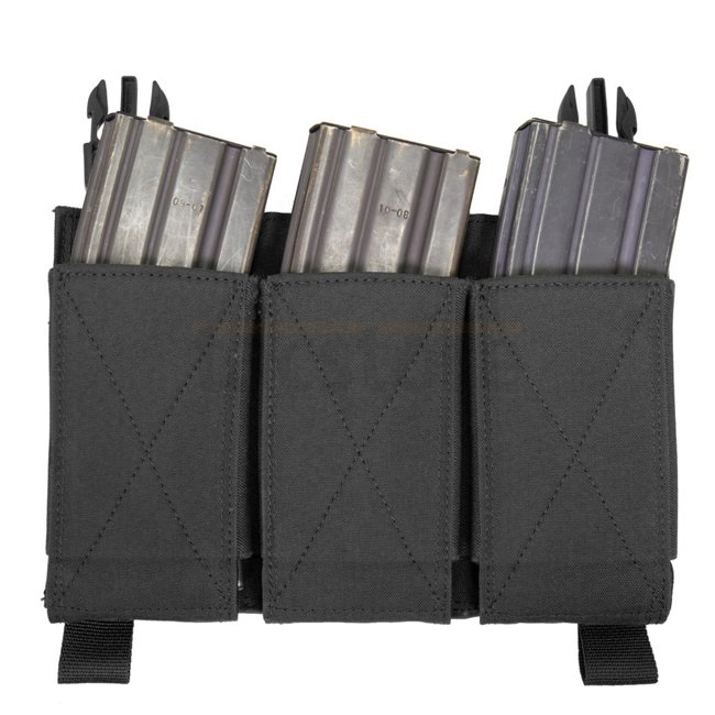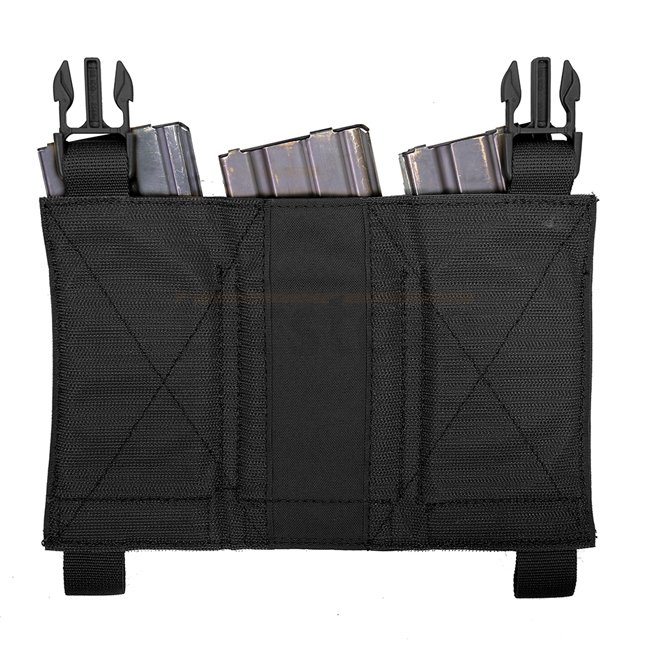 Warrior Porte-Triple Mag élastique détachable - Noir : Panneau avant détachable MOLLE de profil bas conçu pour des recharges rapides d'accès rapide. Pochettes élastiques pour M4 et P-Mags, polyvalentes pour divers besoins opérationnels.