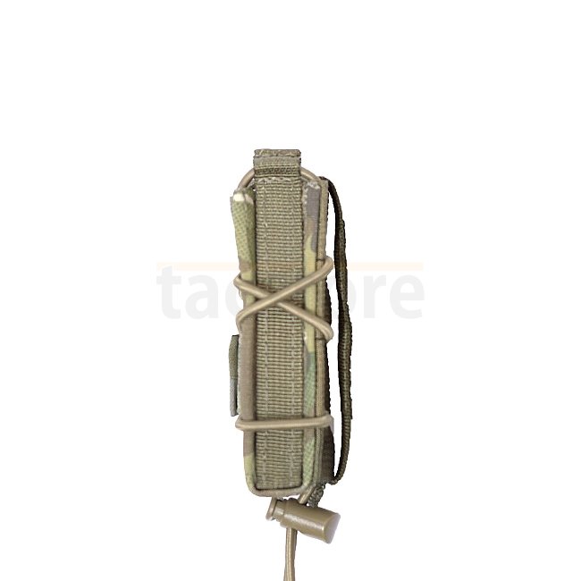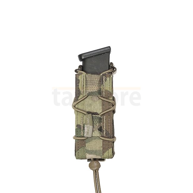 La pochette Warrior Single Quick Mag est une pochette polyvalente conçue pour transporter divers chargeurs de pistolet 9mm. L’ajustement de la taille se fait à l’aide de cordons élastiques passant sur les côtés de la pochette, assurant une fixation sécurisée du chargeur.