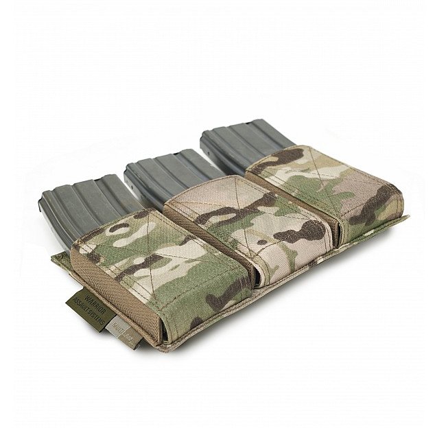 Pochette triple élastique Warrior bas profil en Multicam pour des rechargements rapides avec rétention. Compatible avec les chargeurs de style M4 et AK, métalliques et PMAGs.