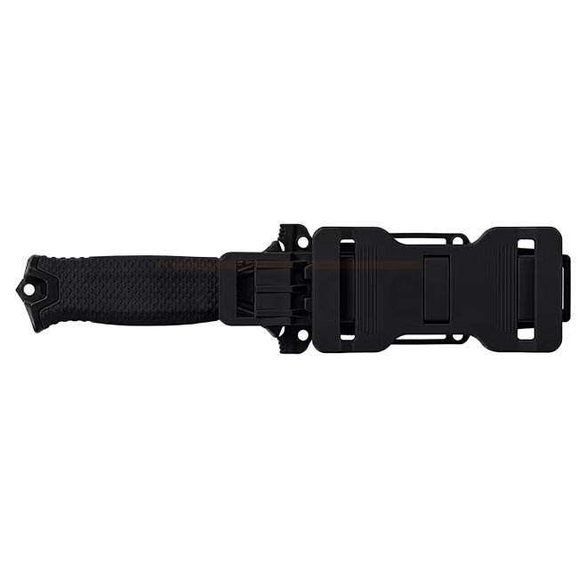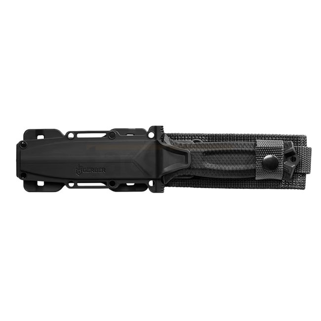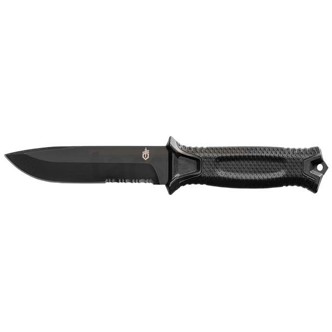 Das Gerber StrongArm mit gezahntem Klingenrand - Schwarz ist ein robuster und langlebiger Survival-Messer, perfekt für Abenteuer im Freien. Mit einer 127 mm langen Klinge aus 420HC-Stahl, einem gummierten Griff für einen sicheren Halt und einem Gewicht vo