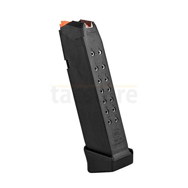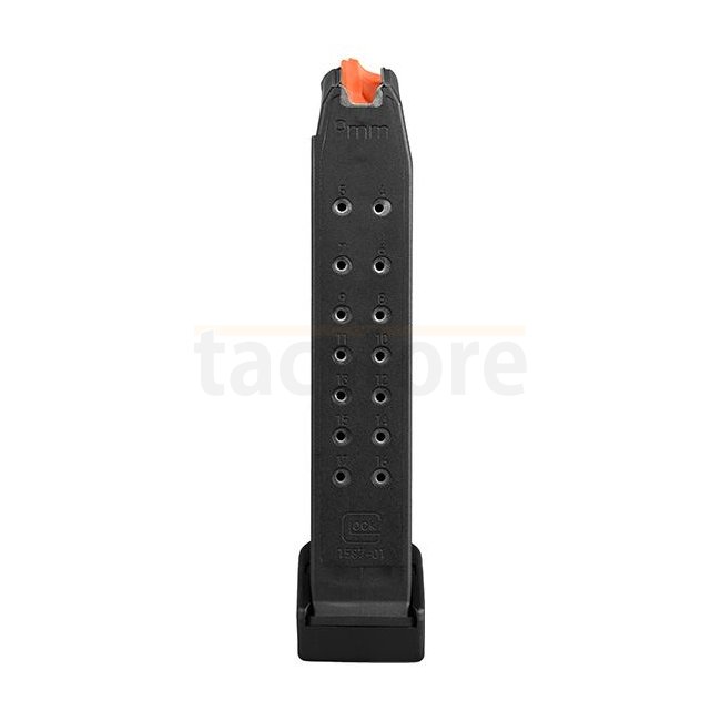 Verbessern Sie Ihre Glock 17 mit diesem 19-Schuss 9mm Magazin, ausgestattet mit einem orangefarbenen Follower für verbesserte Sichtbarkeit und Zuverlässigkeit bei längeren Schießsitzungen.