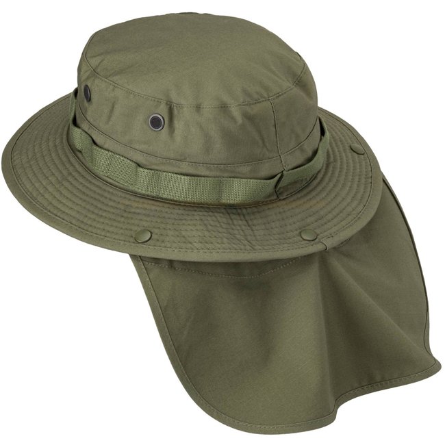 Helikon-Tex Boonie-Hut in Olivgrün, Größe XL. Militärinspirierter Breitkrempenhut, entworfen für Wald- und Wüstenoperationen. Bietet Sonnen- und Regenschutz, abnehmbaren Nackenschutz und Tarnnetz. Leichter, atmungsaktiver Stoff.