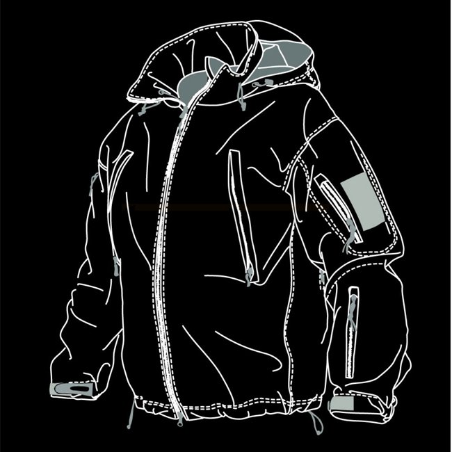 Die Gunfighter Windblocker Jacke ist mit einen hohem Kragen und einer darin verstaubaren Kapuze mit elastischem Kordelzug ausgestattet. Die Kapuze kann zudem verstellt werden ohne die Hände aus den Taschen zu nehmen: in den Brusttaschen befinden sich zwei Zugbänder mit denen sich die Kapuze regulieren lässt. Des Weiteren verfügt die Jacke über eine Tasche mit Klettverschluss auf der Innenseite, zwei Oberarmtaschen mit Reissverschluss und Klettflächen, eine kleine Tasche mit Reissverschluss auf dem linken Unterarm sowie eine Tasche im unteren Rückenbereich. Die Brust- und Armtaschen verfügen über D-Ringe sowie Kabelöffnungen für Funkausrüstung, MP3 Player, Mobiltelefon etc. Auf der Front findet sich ein starker, windfester Reissverschluss, unter den Armen verfügt sie Zwecks Belüftung über Öffnungen mit Reissverschüssen und sie hat verstellbare Klett-Manschetten sowie einen Kordelzug mit Kordelstopper am Bund.