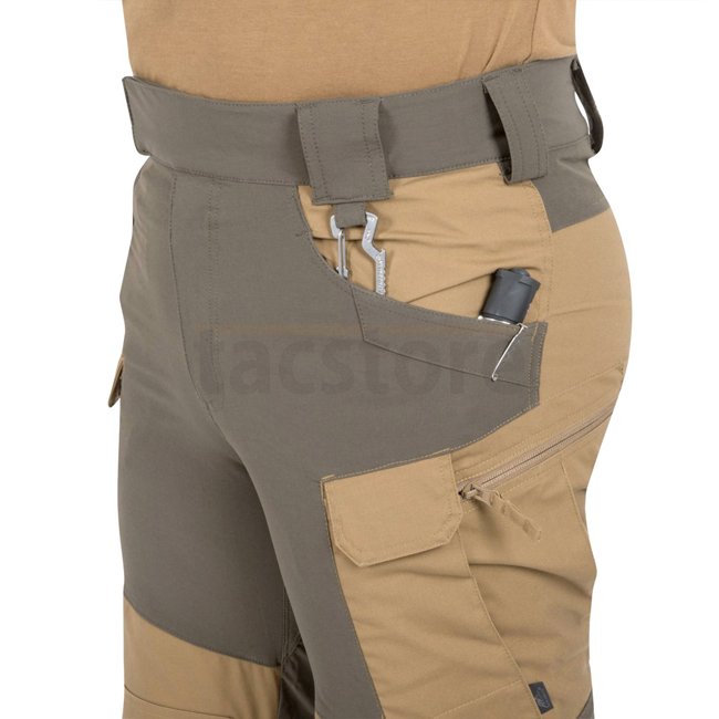 Die Helikon-Tex Hybrid Outback-Hose ist langlebig und komfortabel, mit wachsimprägnierbarem Stoff. Zu den Eigenschaften gehören verstärkte Taschen, Cargotaschen, Kniefortsetzungen und verstellbare Beinsäume.