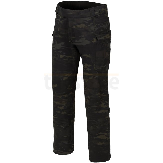 Die Hose hat einen lockeren, profilierten Schnitt. Der Gürtel ist mit Klettband befestigt, was eine zusätzliche Feineinstellung ermöglicht. Breite Gürtelschlaufen nehmen Gürtel mit einer Breite von bis zu 45mm auf, auch wenn Holster- oder Magazintaschen installiert sind. Für zusätzliche Bewegungsfreiheit finden sich Einschübe aus elastischem VersaStretch Material auf der Rückseite sowie im Schrittbereich. Klassische Fronttaschen mit Verstärkungen an den Kanten vermeiden eine Beschädigung durch Messerklammern. Zusätzliche Gesäßtaschen mit verstärkten Kanten passen fassen auch größere Gegenstände wie Magazine. An den Oberschenkeln befinden sich große, geräumige Cargotaschen mit Knöpfen. An den Unterschenkeln fassen kleinere geschlossene Taschen mit Klettverschluss wichtige Ausrüstung wie Feldverbände oder ein Tourniquet.