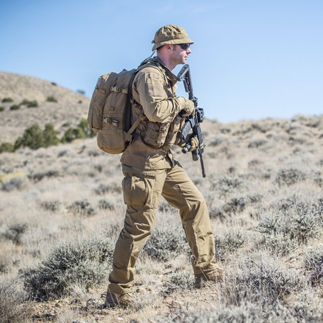 Die Hose hat einen lockeren, profilierten Schnitt. Der Gürtel ist mit Klettband befestigt, was eine zusätzliche Feineinstellung ermöglicht. Breite Gürtelschlaufen nehmen Gürtel mit einer Breite von bis zu 45mm auf, auch wenn Holster- oder Magazintaschen installiert sind. Für zusätzliche Bewegungsfreiheit finden sich Einschübe aus elastischem VersaStretch Material auf der Rückseite sowie im Schrittbereich. Klassische Fronttaschen mit Verstärkungen an den Kanten vermeiden eine Beschädigung durch Messerklammern. Zusätzliche Gesäßtaschen mit verstärkten Kanten passen fassen auch größere Gegenstände wie Magazine. An den Oberschenkeln befinden sich große, geräumige Cargotaschen mit Knöpfen. An den Unterschenkeln fassen kleinere geschlossene Taschen mit Klettverschluss wichtige Ausrüstung wie Feldverbände oder ein Tourniquet.