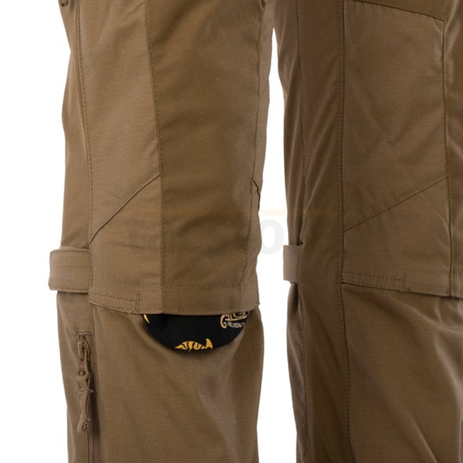 In wichtigen Bereichen (Taille, Schritt und Kniekehlen) wurden Einsätze aus Versastrech-Material verwendet. Es trocknet schnell und ist hoch atmungsaktiv. Der Kniebereich ist mit 500D Cordura-Gewebe mit Schlitzen für Schutzeinsätze verstärkt. Dank zusätzlicher Kordeln, die sich unter dem Knie und am unteren Beinende befinden, lässt sich die Hose leicht an das Bein anpassen.