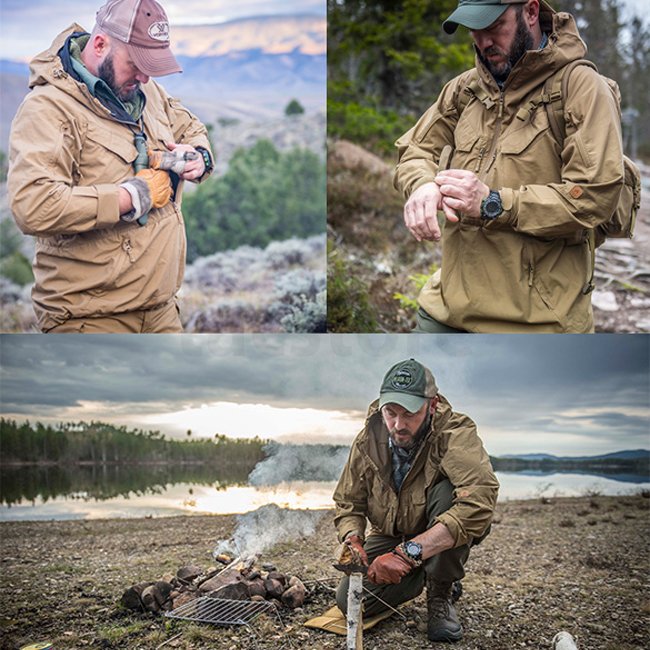 Die Pilgrim Anorak Jacke wurde für anspruchsvolle Outdoor-Aktivitäten bei sich dynamisch ändernden Wetter-Konditionen entwickelt. Der bewährte "Känguru" Schnitt wurde hier weiter verfeinert, um den Erwartungen moderner Outdoor-Enthusiasten gerecht zu werden, ohne den klassischen Look einzubüssen. Zahlreiche Taschen ermöglichen eine bequeme Platzierung der Ausrüstung, während sie aufgrund ihrer charakteristischen Anordnung auch im Sitzen oder Knien ständig verfügbar sind. Der Schnitt wurde verlängert, um optimalen Schutz für den Körper zu gewährleisten, unabhängig von der Ausrüstung die getragen wird. Durch das Absenken der "Känguru" Tasche konnte der Reissverschluss verlängert werden, um bei anstrengenden Aktivitäten eine optimale Belüftung zu gewährleisten.