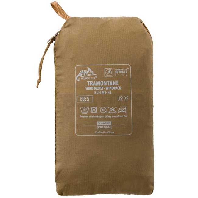 Die Helikon-Tex Tramontane Windjacke in der Farbe Coyote und Größe XS ist eine ultraleichte winddichte Schicht, die nur 120 g wiegt. Sie kann in ihre eigene Tasche gepackt werden, was eine einfache Aufbewahrung und Tragbarkeit ermöglicht. Hergestellt aus