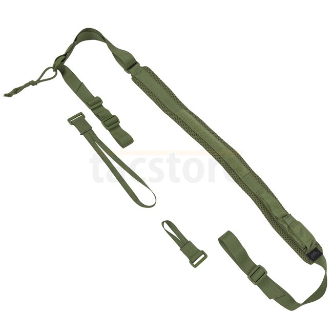 Helikon-Tex Zwei-Punkt-Karabinerriemen - Olivgrün. Hergestellt aus strapazierfähigem Nylon-Gurtband mit gepolstertem Komfortpad und durch Klettverschluss verschließbarer Batterietasche. Verfügt über eine Schlaufe mit Klettverschlussstreifen zur Personalis
