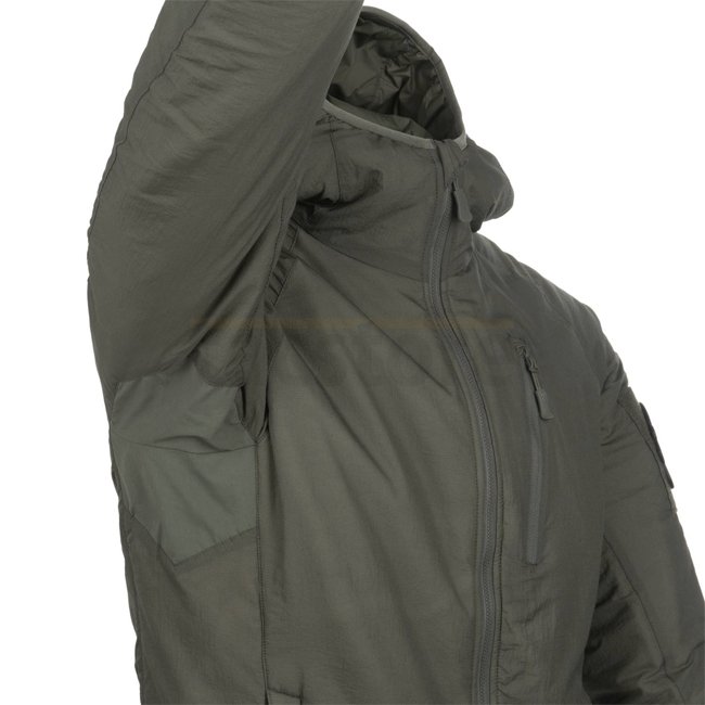 Leichtgewichtiger Helikon-Tex Wolfhound Climashield Hoodie in Alpha Green mit WindPack-Nylon-Außenmaterial, Climashield Apex-Dämmung, 3 externen Reißverschlusstaschen, 1 interner Reißverschlusstasche, Schlaufenpanel zur Personalisierung, verstellbarer Kap