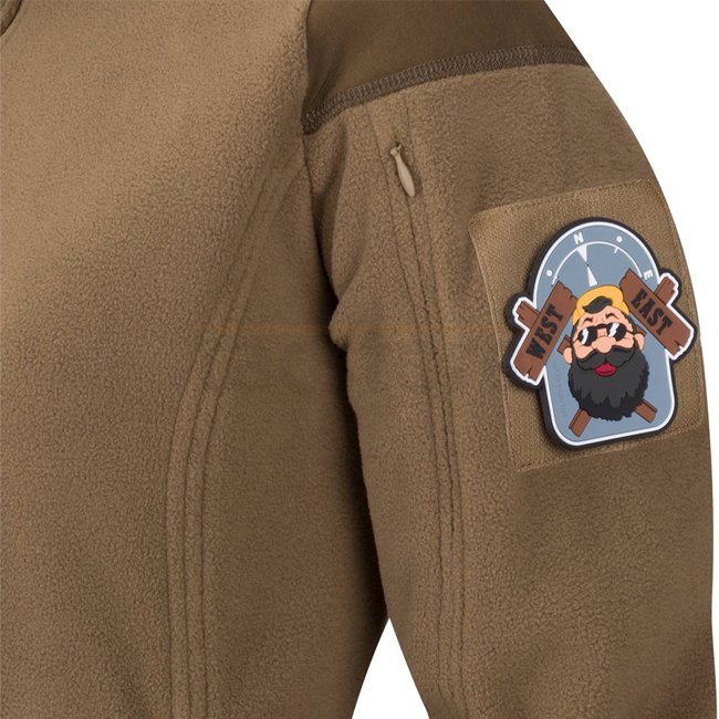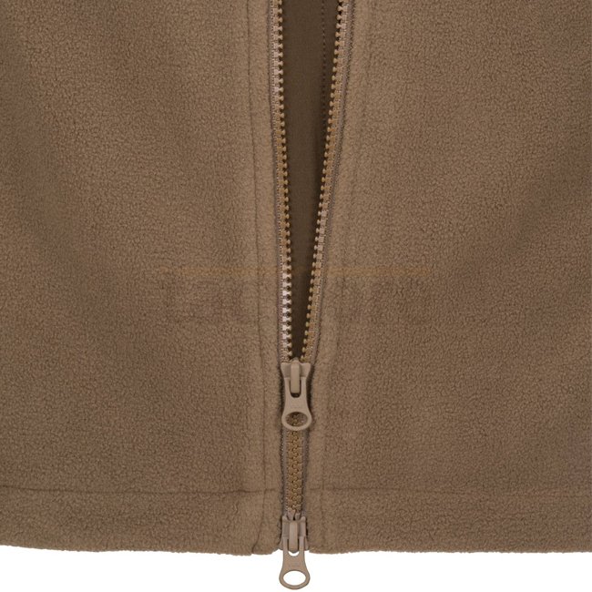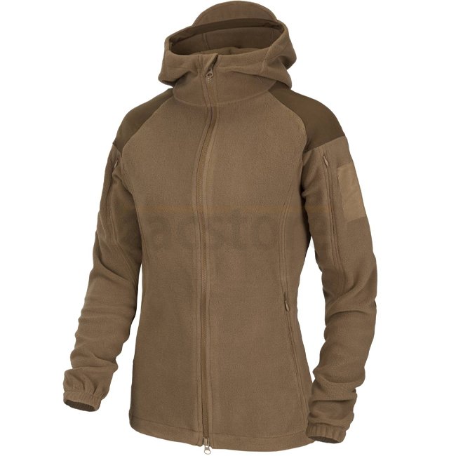 Stilvolle Helikon-Tex Damen Cumulus Heavy Fleece Jacke in der Farbe Coyote, maßgeschneidert für Frauen mit anatomischem Schnitt und verbesserten Details. Ausgestattet mit YKK-Reißverschlüssen, Reißverschlusstaschen, Einsatzpaneelen, Kapuze mit Sichtschutz