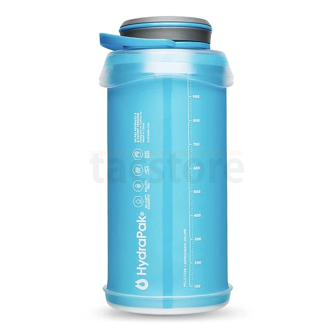 Bleiben Sie unterwegs hydratisiert mit der Hydrapak Stash Bottle 1000ml in der Farbe Malibu. Kompaktes Design mit einem Volumen von 1000ml, leicht mit 84g und einfach zu tragen mit den Abmessungen im geöffneten Zustand - 210 x 100mm und im geschlossenen Z