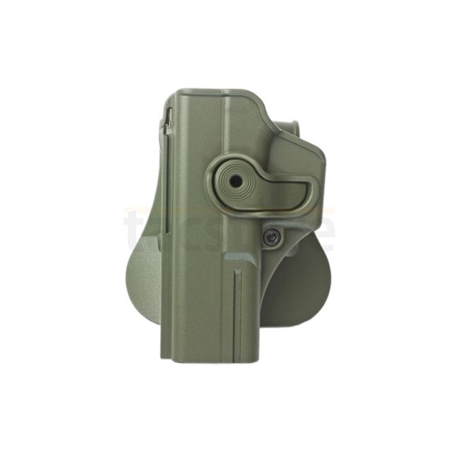 Ihren Glock 17/22/31 sicher tragen mit dem IMI Defense Roto Polymer Holster. Vollständig verstellbar, 360-Grad-Drehung, langlebige Polymerkonstruktion. Ideal für Zivilisten, Beamte und Militärpersonal. Linkshändiges Design mit Schutzkanal für die Visierun