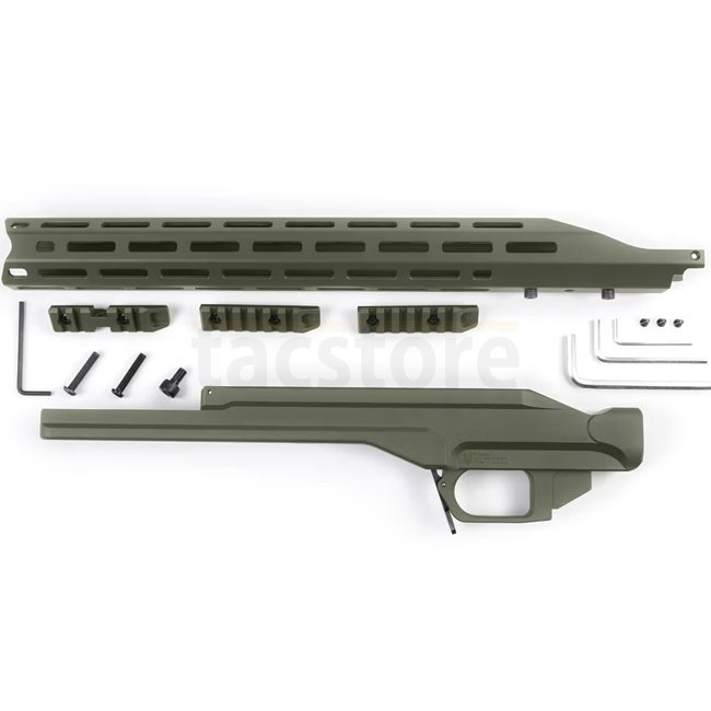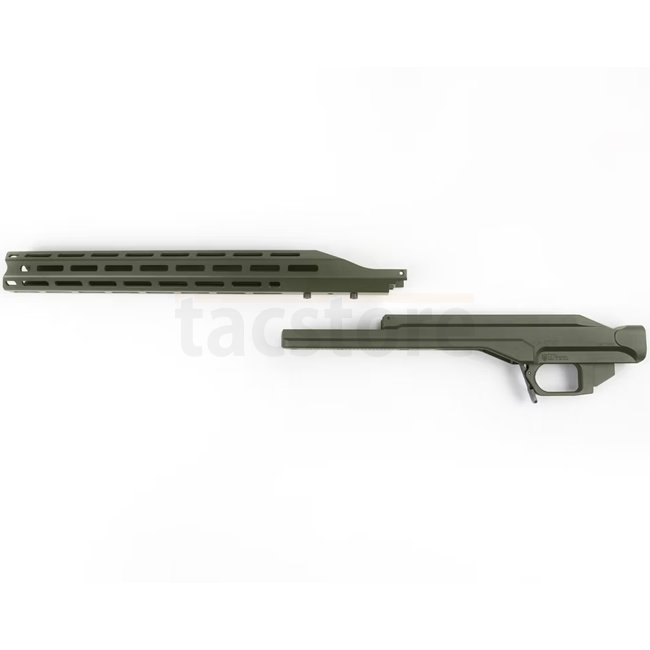 Hinweis: Lieferumfang: Chassis, Vorderschaft, Zweibeinadapter, zwei Picatinny-Schienen und Montageschrauben. Hinterschaft und Zubehör separat erhältlich.