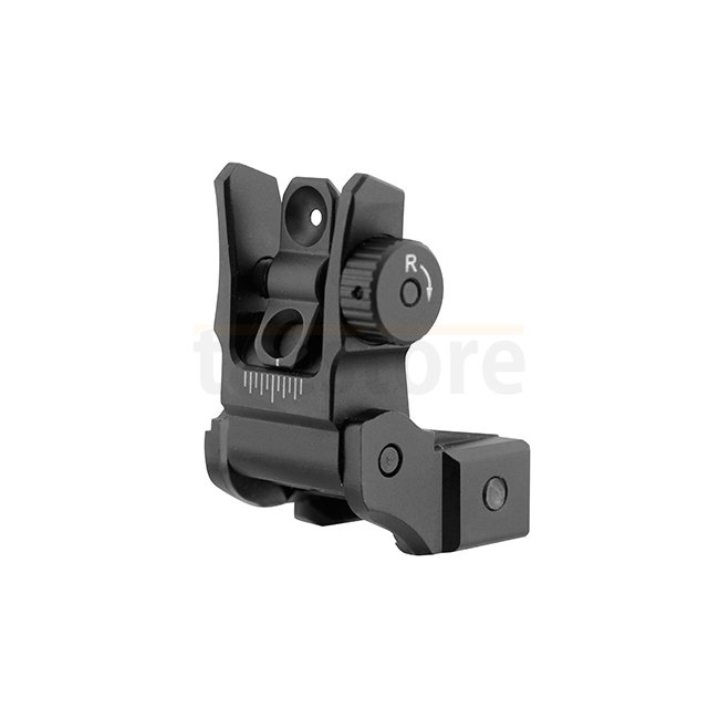 Verbessern Sie Ihre Schießgenauigkeit mit dem Leapers Low Profile Flip-Up Rear Sight in eleganter schwarzer Farbe. Entwickelt für die Montage auf einer Picatinny-Schiene, bietet dieses schlanke Visier eine robuste Konstruktion aus 6061-T6 Aluminium und St