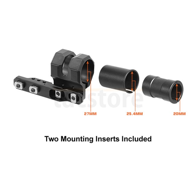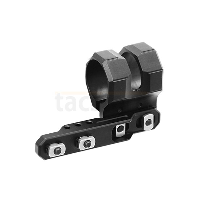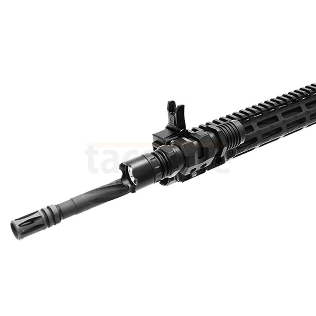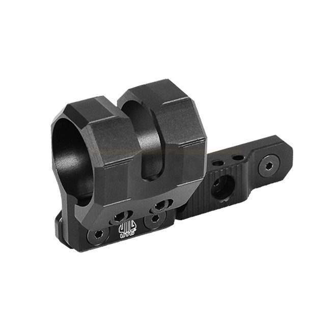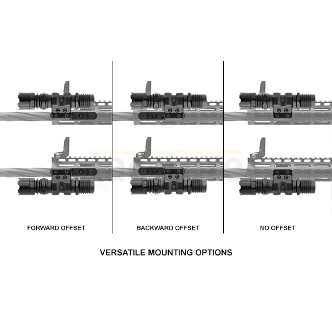 Leapers M-LOK Offset Taschenlampenringhalterung in Schwarz mit abnehmbarem Offset-Design und Polymer-Einsätzen für vielseitige Taschenlampenkompatibilität. Hergestellt aus strapazierfähigem 6061-T6 Aluminium, kompakt bei 88,1 x 52,3 x 33,3 mm und leicht m