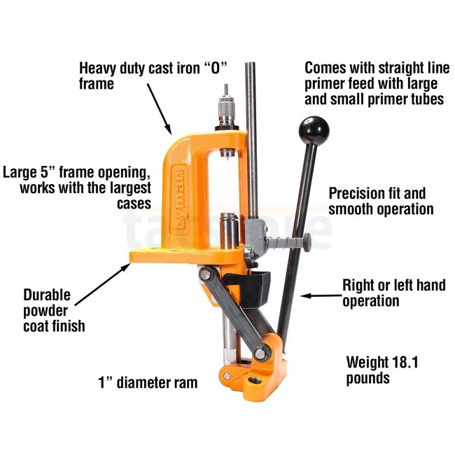 Die Lyman Brass Smith Victory Press ist eine massive Einstationenpresse, die auf maximale Stabilität, Präzision und Langlebigkeit ausgelegt ist. Mit ihrem schweren Gussrahmen, einer großen Öffnung und sanftem Lauf eignet sie sich perfekt auch für große Gewehrkaliber.