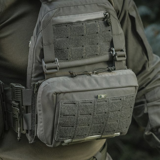 Die Tasche hat ein großes Fach. Die Innenwände der Tasche sind mit Velours ausgekleidet, wodurch Sie modulare Einsätze anbringen oder ein Tablet unterbringen können. Auf der Vorderseite ist eine Klettleiste aufgenäht, die zum Anbringen von Ausrüstung und Aufnähern vorgesehen ist. An der Unterseite der Tasche fügten die Designer ein Gummiband für Light Sticks hinzu. Der Admin Large Elite wird über die MOLLE-Schnittstelle an Ihrer Ausrüstung befestigt.