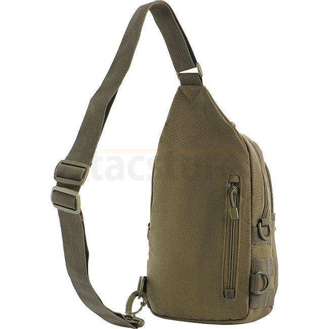 M-Tac Assistententasche in Ranger Grün - kompakter Einzelriemenrucksack mit verstellbarem Gurt für die linke oder rechte Hand. Vordere & seitliche MOLLE-Paneele für zusätzliche Ausrüstung. Material: 600D Polyester. Volumen: 4L. Gewicht: 330g. Maße: 28x16x