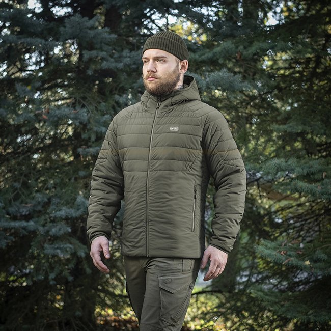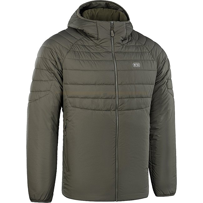 Die M-Tac Berserk Jacke in Oliv, Größe XS, ist eine stilvolle Übergangsjacke aus leichtem, atmungsaktivem, wasserabweisendem Nylon und innovativer österreichischer G-Loft-Isolierung. Diese Jacke verfügt über Reißverschlusstaschen, eine Innentasche und ein