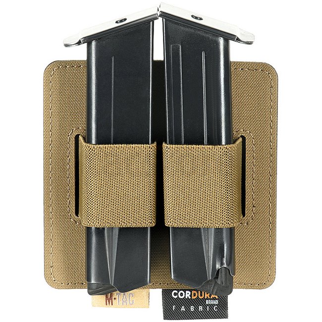 Kompakte M-Tac Doppel-Magazintasche in Coyotefarbe, konzipiert für das Tragen von zwei Pistolenmagazinen oder ähnlichen Gegenständen wie einem Multitool oder einer kleinen Lampe. Klettverschluss, verstellbares Volumen. Cordura 1000D Material. Maße 10x10 c