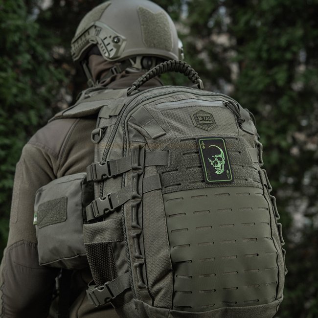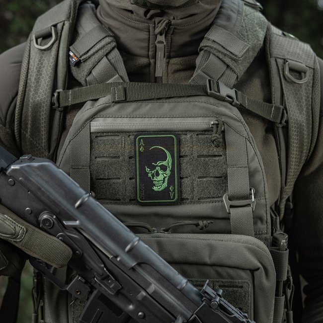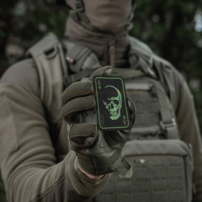 Der M-Tac Face of War Stickerei Patch in Oliv zeigt ein Pik-Ass Kartenmotiv mit einem Totenkopf-Stickerei, welches Furchtlosigkeit in Gefahr und Sieg über den Tod symbolisiert.