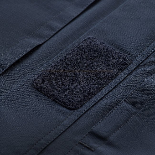 Die M-Tac Patrol Flex Jacke in Dunkelmarineblau bietet einen bequemen, leicht angepassten Schnitt mit Merkmalen wie einem Stehkragen, zentralem Reißverschluss, versteckten Taschen, Klettflächen, Achselösen für Belüftung, verstärktem Schulterbereich, erwei