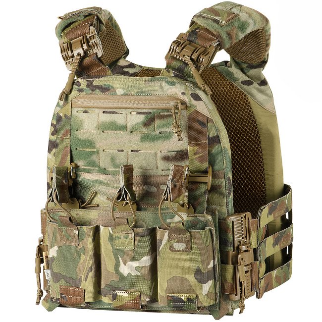 Der M-Tac Plate Carrier Cuirass FAST QRS in Multicam - ein revolutionärer Plattenträger von M-Tac mit einem Schnellverschlusssystem, modularen Taschen und Cordura-Materialien.