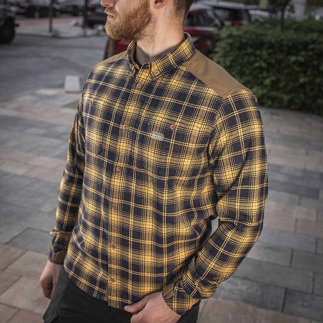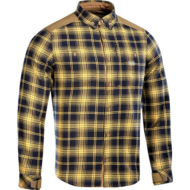 M-Tac Redneck Hemd in Marineblau/Gelb, L Regular: Vielseitiges und strapazierfähiges taktisches Karohemd mit wind- und feuchtigkeitsabweisenden Schulterverstärkungen. Klassischer Look, Klettverschlüsse für verstellbare Manschetten. Ein Muss für jede Geleg