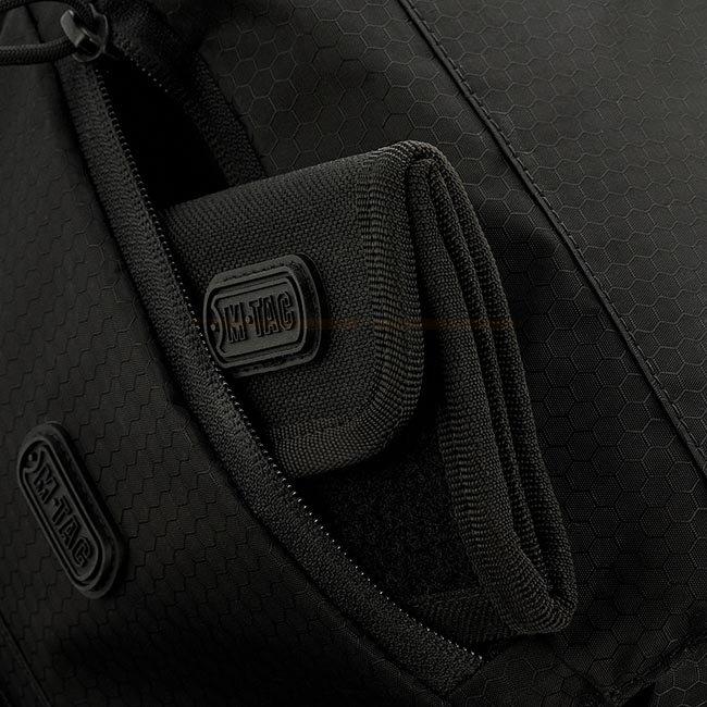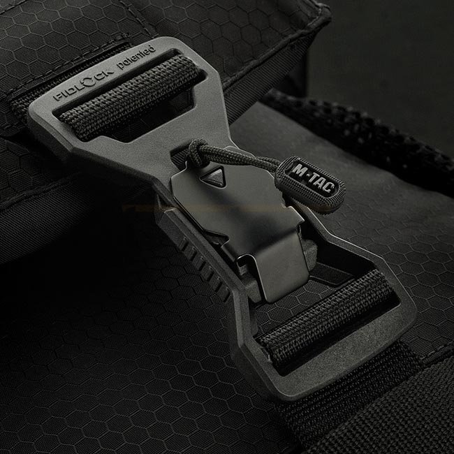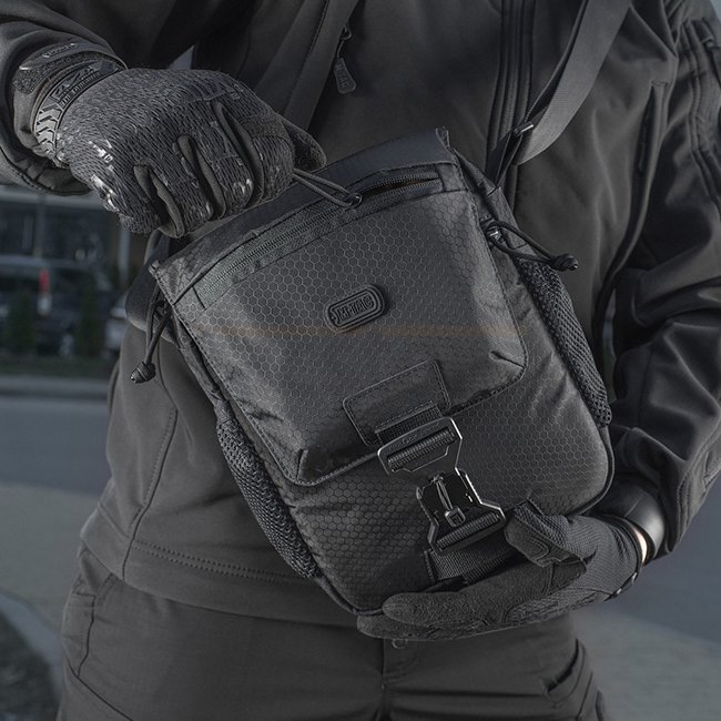 M-Tac Satellite Magnet Tasche Elite Hex - Schwarz ist eine multifunktionale Organizer-Tasche aus Hex Polyester und Cordura 1000D Materialien. Sie verfügt über YKK- und Woojin-Reißverschlüsse und Schnallen, Fidlock-Magnetverschluss, verstellbaren Nylon-Sch