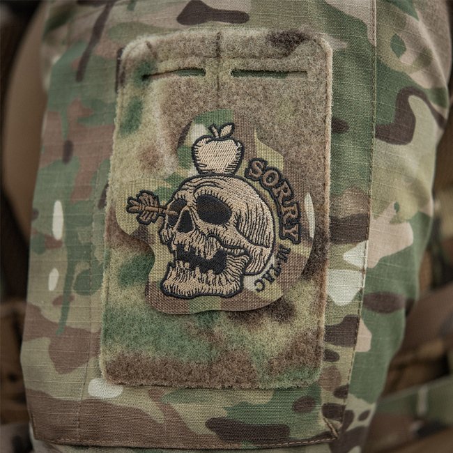 M-Tac SORRY Stickerei-Patch in Multicam, hergestellt mit Cordura 500D Vordermaterial und Hakenflächenrückseite. Maße 83 x 85 mm.