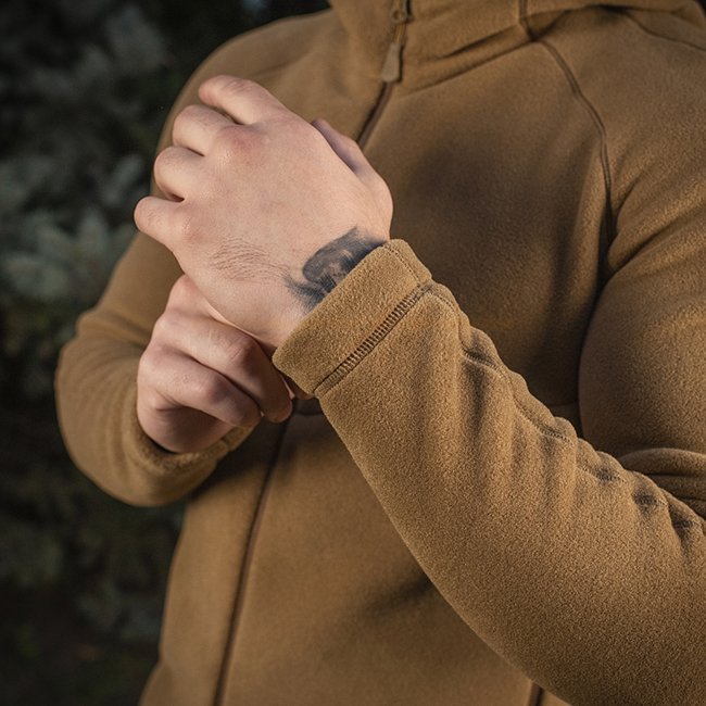Hergestellt aus hochwertigem Polartec 200 Fleece. Dieses Material ist strapazierfähig und angenehm für den Körper, hält die Wärme gut und fusselt nicht. Der hohe Kragen der Kapuze schützt zuverlässig vor Kälte und Wind. Die Raglanärmel sind speziell für Komfort und Bewegungsfreiheit geschnitten. Dieser Schnitt verhilft zu einer ungewöhnlichen Schulterform, was zu einer stilvollen, abgerundeten Silhouette führt. Flachnähte garantieren Tragekomfort und scheuern nicht.