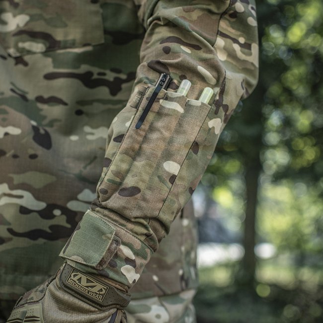 • Praktische Taschen: Zwei grosse Brusttaschen mit Klettverschlussflappen für einfachen Zugang und sicheren Halt. Vertikal zugängliche Taschen an beiden Ärmeln, die durch Cordura-Material verstärkt sind, um die Abnutzung zu reduzieren. Fächer für Leuchtstäbe, Stifte und Marker auf dem linken Ärmel.