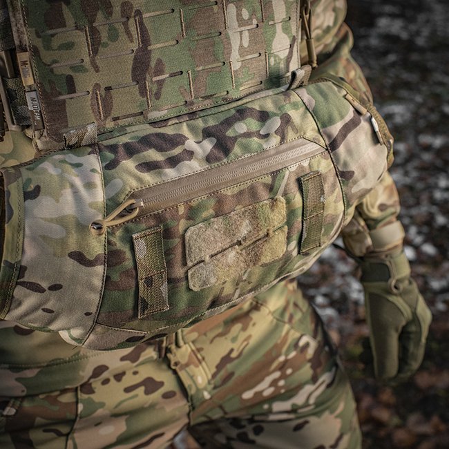 Die Vordertasche mit wasserdichtem AquaGuard Reißverschluss eignet sich perfekt zum Verstauen von Dokumenten, Handy, Leuchtstäben und anderen wichtigen Gegenständen. Auf der Vorderseite befindet sich eine Klettfläche für Patches und MOLLE Riemen für zusätzliche Ausrüstung.