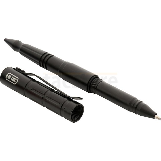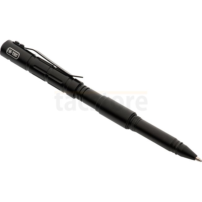 Ein taktischer Stift, der als gewöhnlicher Schreibstift verwendet werden kann. Er besteht aus Flugzeugaluminium mit schwarz eloxiertem Finish und hat eine geriffelte Oberfläche für einen festeren Halt. Auf der einen Seite des Stifts befindet sich ein Glasbrecher und auf der anderen Seite eine Kappe mit Clip.