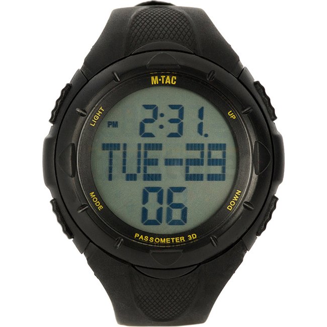 M-Tac Taktische Uhr & Schrittzähler - Schwarz. Ideal für Sport & Outdoor-Aktivitäten. Inklusive Schrittzähler, Distanz- & Kalorienzähler. Verfügt über Alarme, Stoppuhr, Timer und WR50 Wasserdichtigkeit.