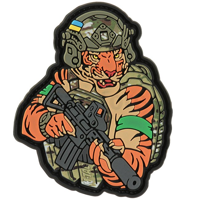 M-Tac Tiger Green Tape Gummipatch - Multicam, hergestellt aus PVC-Material auf der Vorderseite mit Hakenfläche auf der Rückseite. Abmessungen: 90 x 70 mm.